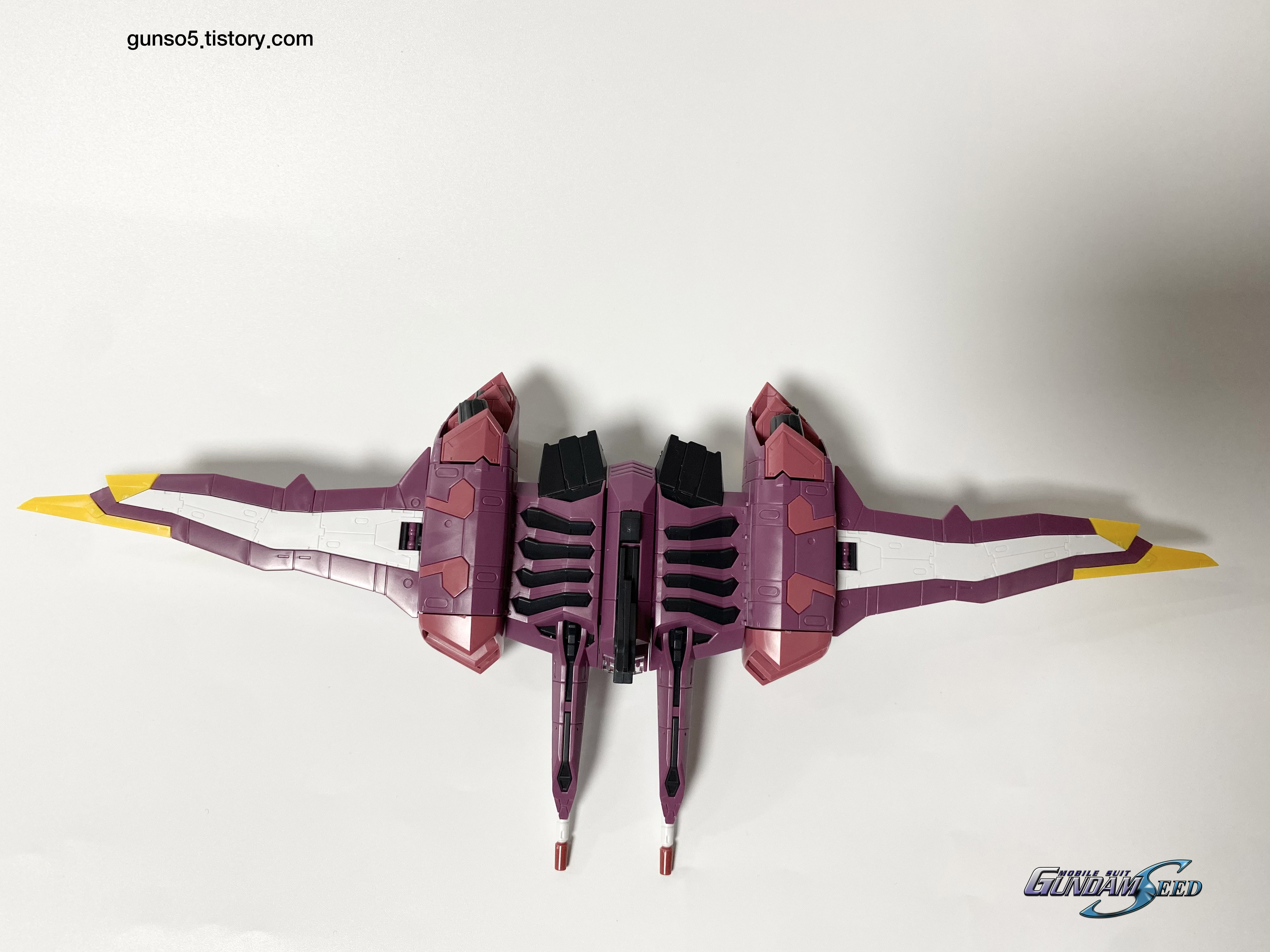 저스티스 건담의 상징과도 같은 공중 기동 비상체 파툼도 더 멋지고 디테일합니다. 프라모델의 한계로 등에 장착을 해주면 어쩔수 없이 받침대를 사용해야합니다. 무게 중심이 안맞아서 뒤로 쓰러지기 때문이죠. 메탈빌드라도 저런 받침대가 필요할 것 같네요.