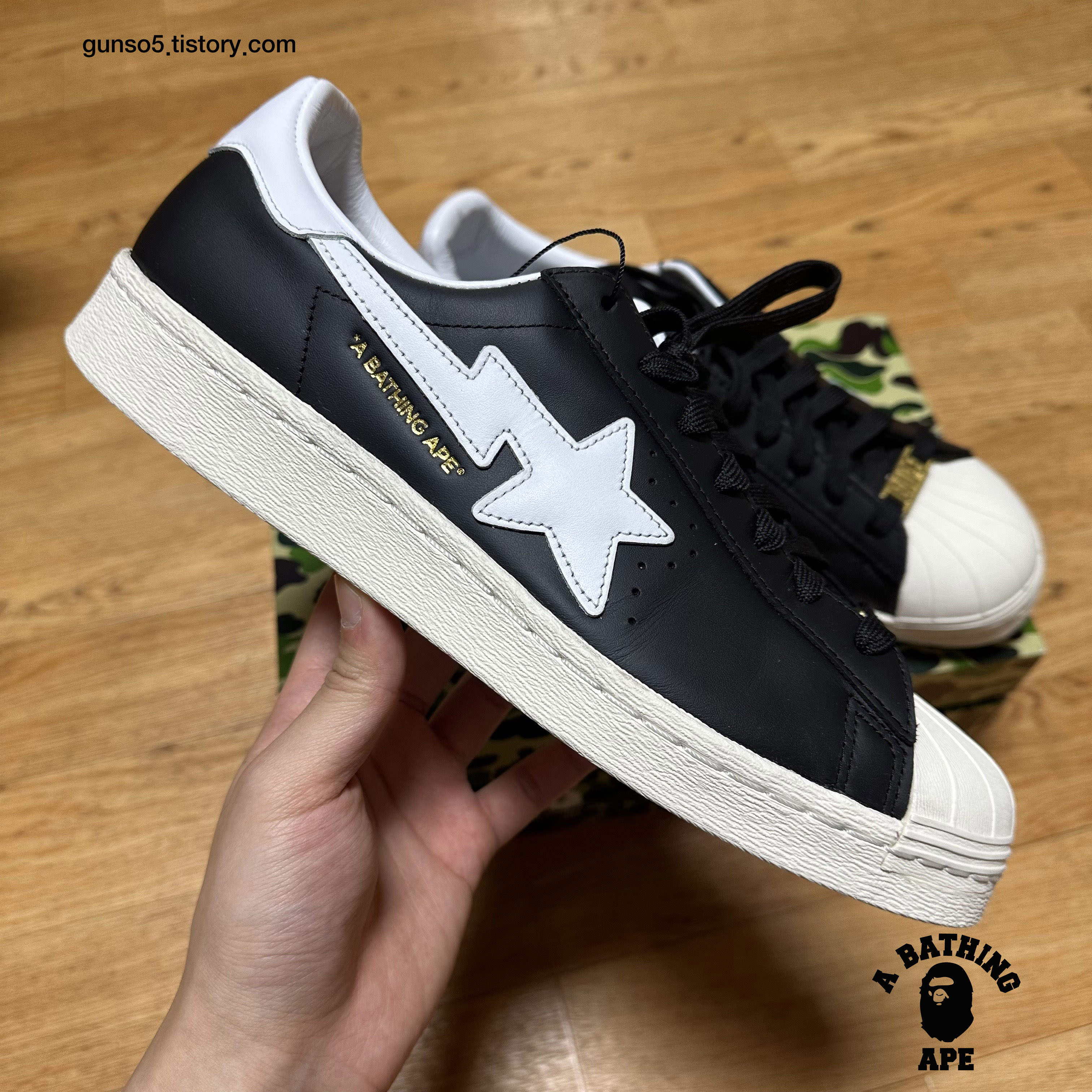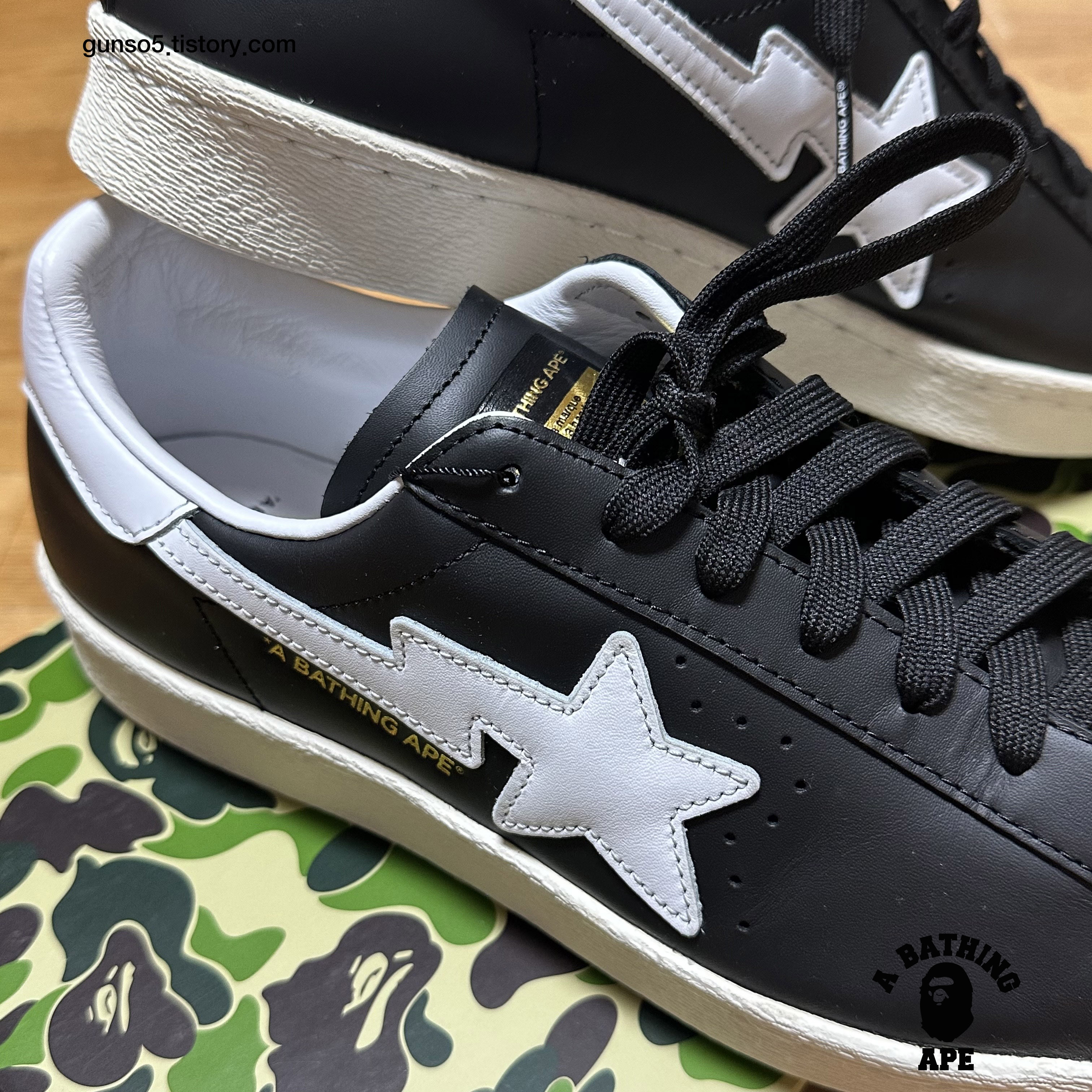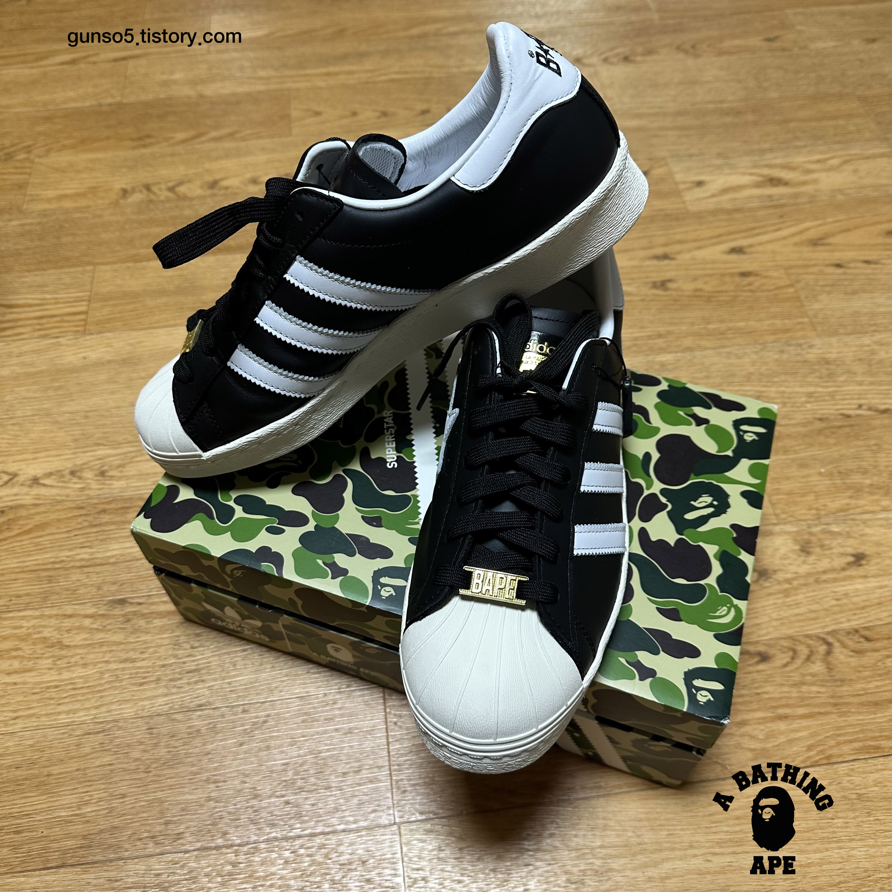 아디다스 슈퍼스타 80s 디자인을 베이스로 베이프의 스니커 라인업인 베이프스타 (bape sta)의 상징인 별모양 패치가 포인트로 들어가있습니다.