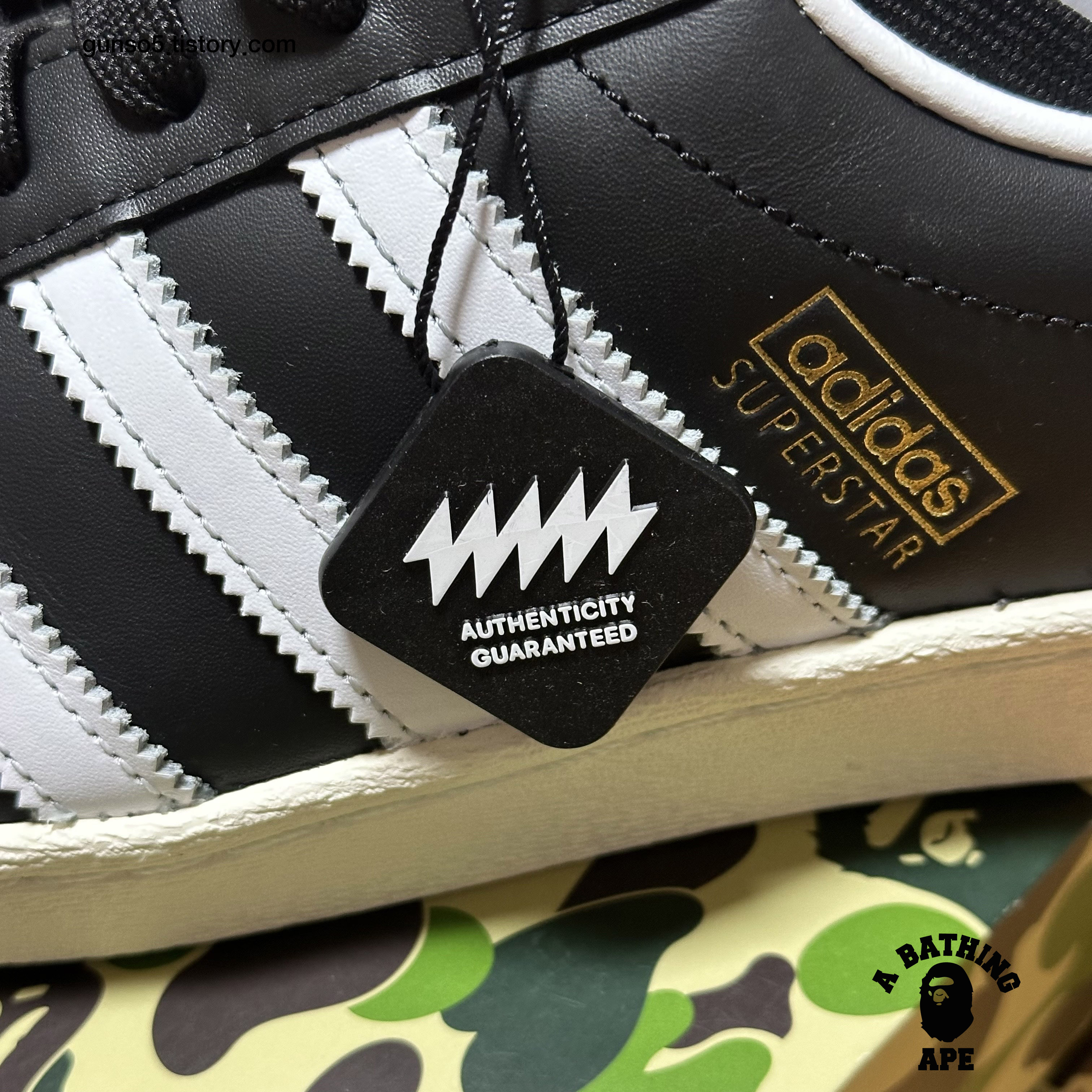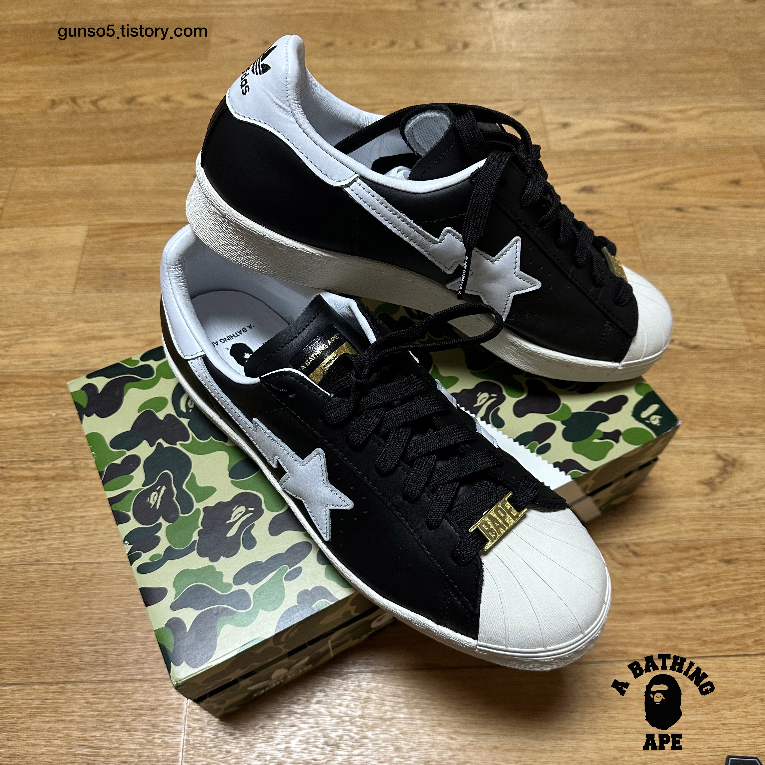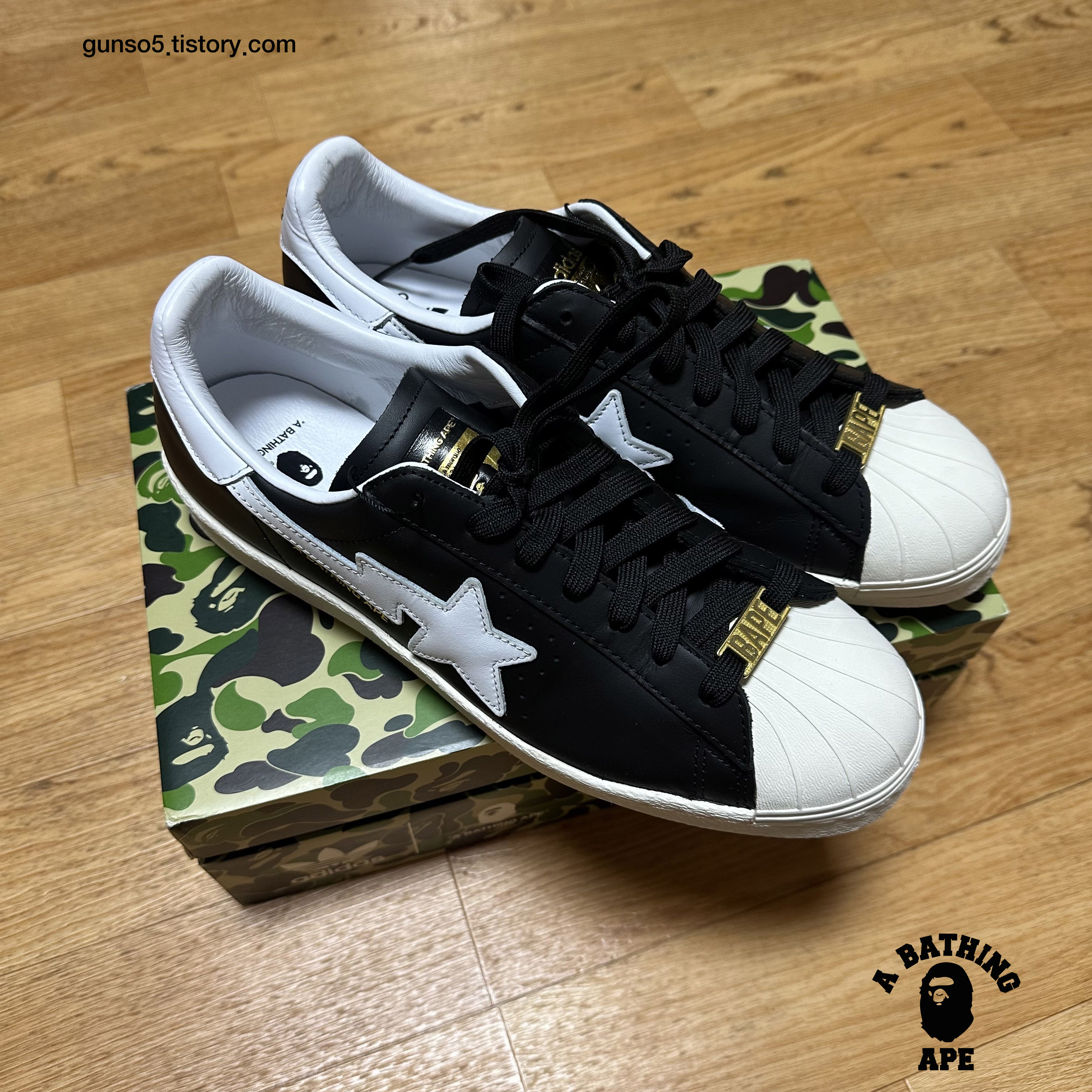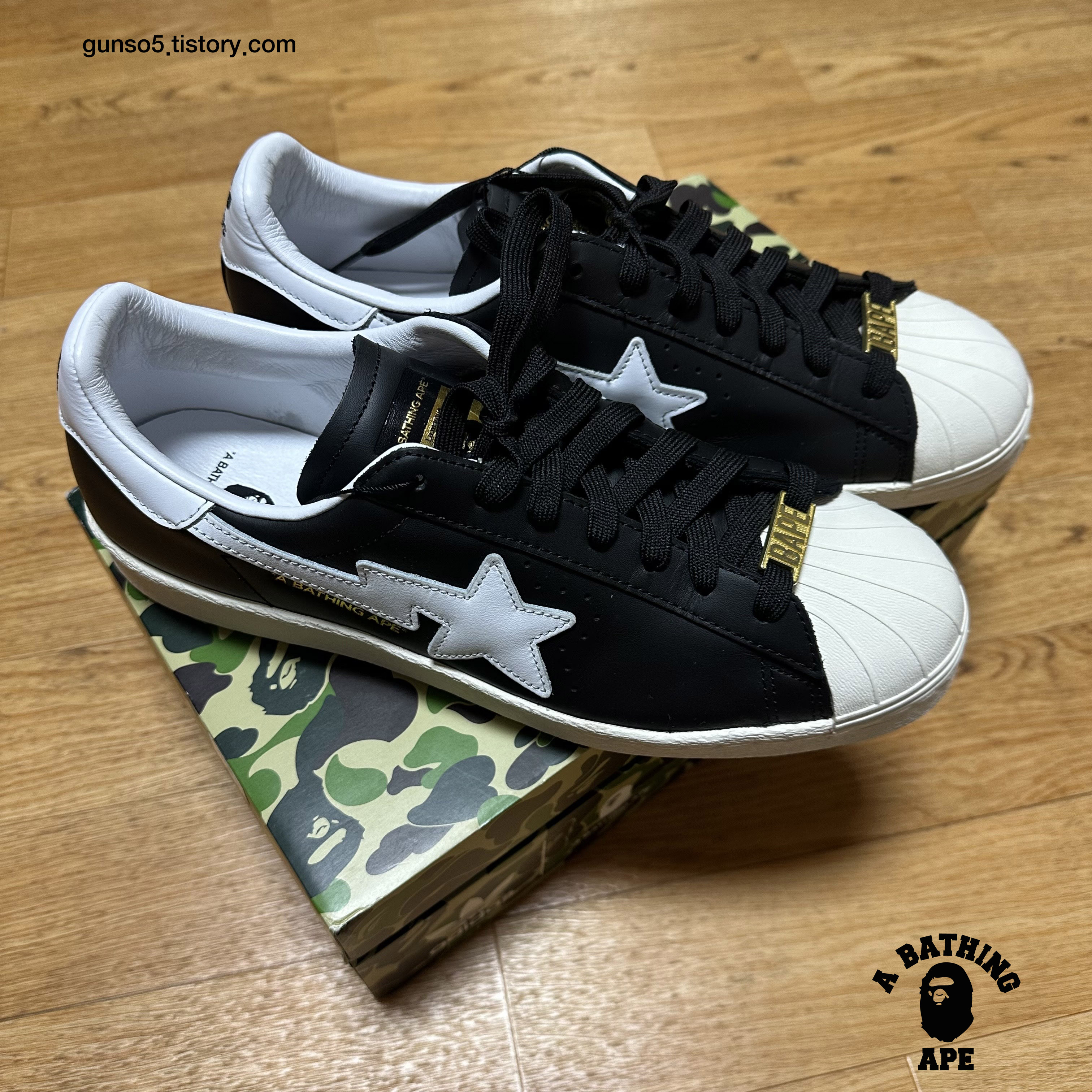아디다스 슈퍼스타 80s 디자인을 베이스로 베이프의 스니커 라인업인 베이프스타 (bape sta)의 상징인 별모양 패치가 포인트로 들어가있습니다.