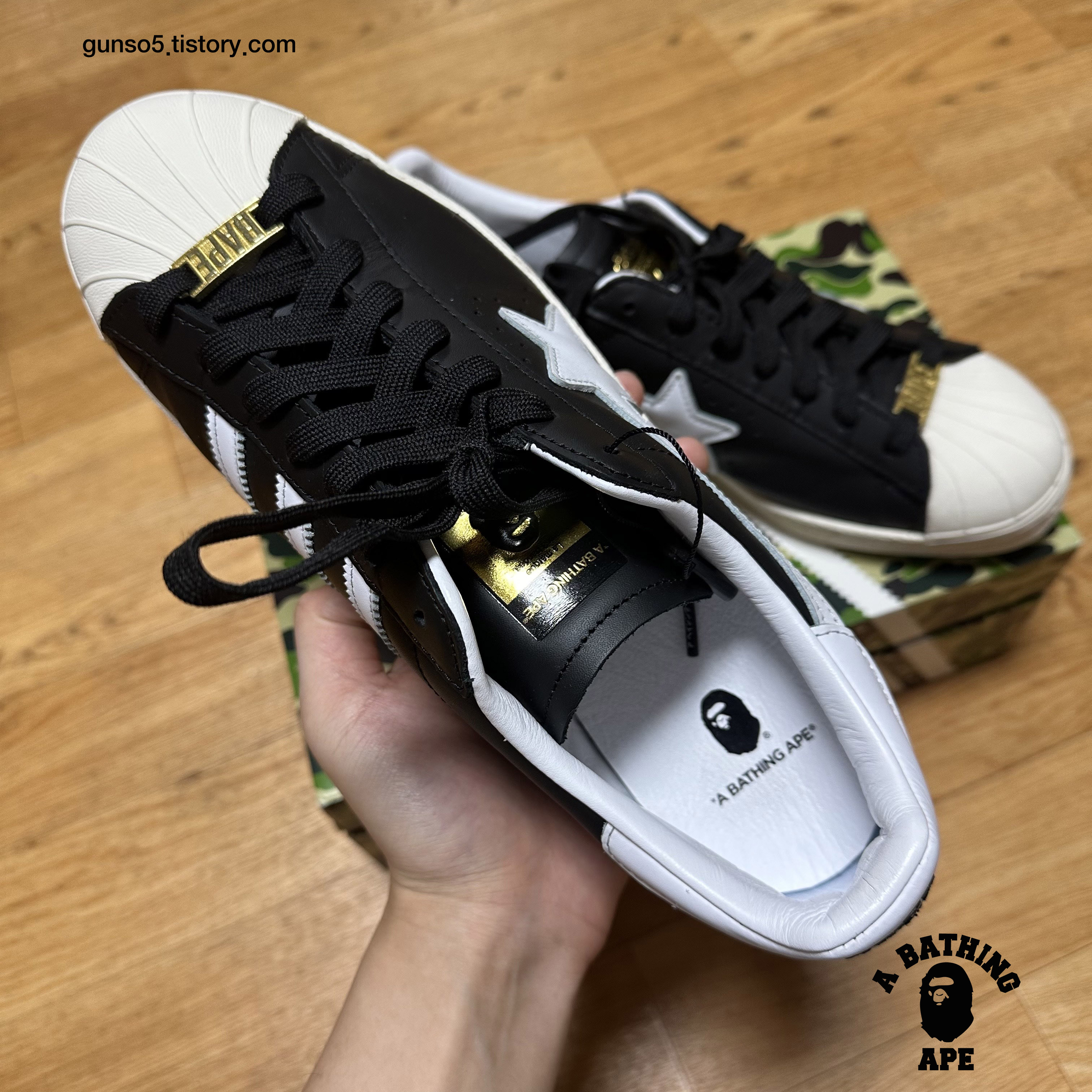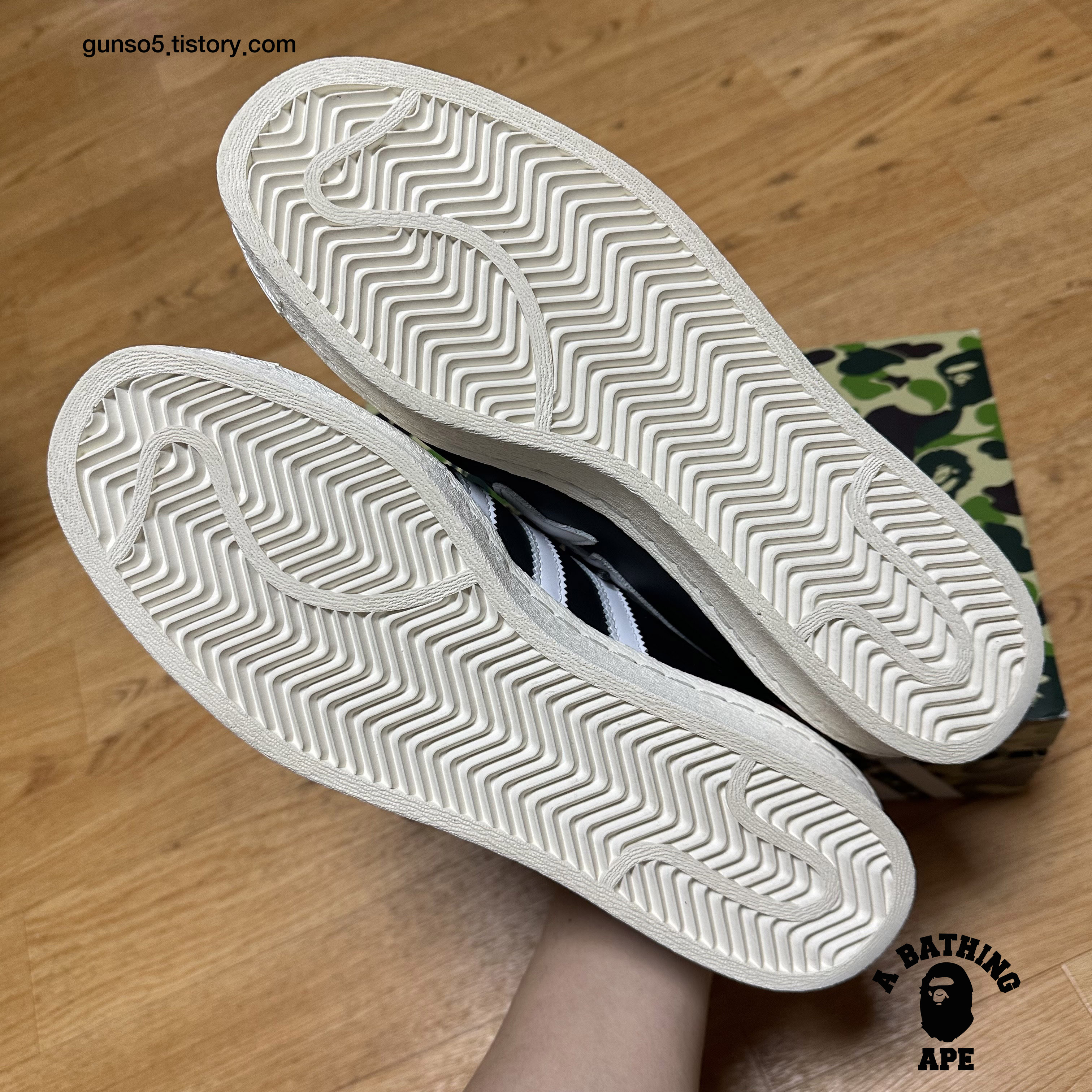 혀탭에는 한쪽에는 베이프 로고, 한쪽에는 아디다스 로고가 있고, 인솔 역시 베이프의 로고와 아디다스 로고가 한짝씩 사이좋게 프린팅 되어있습니다.