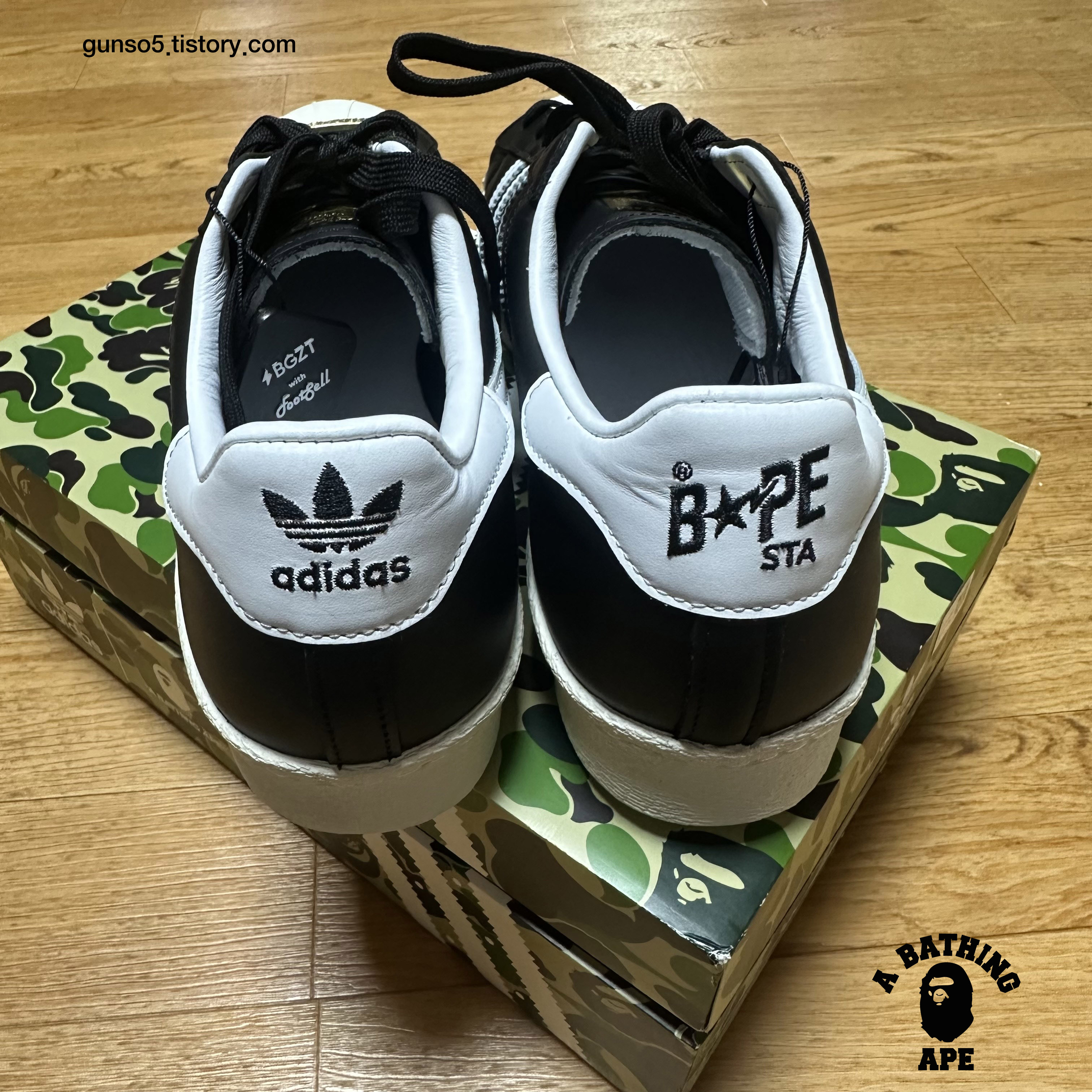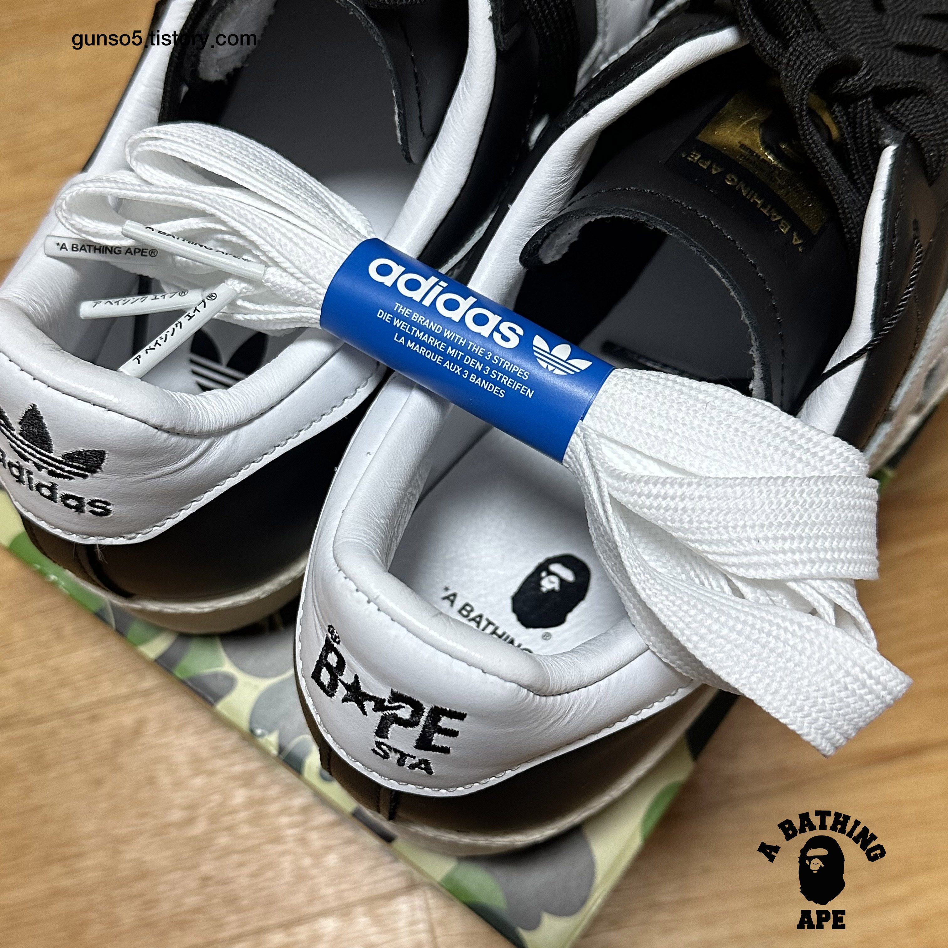 재밌는 요소는 한쪽은 베이프 스타의 로고, 한쪽은 아디다스의 삼선 로고라는 점입니다. 양 발 모두 같은 방향으로 로고가 박혀있어서 한쪽발에는 아디다스 로고가 다른 발에는 베이프 로고가 밖을 향하게 되어 있습니다.